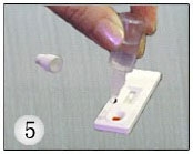 在加入血液后2秒鐘后,加入1滴緩沖液,防止血液凝固。血樣和緩沖液加入后即可看到擴(kuò)散反應(yīng),會(huì)慢慢流過(guò)觀察區(qū)。 一般5分鐘后,混合液已流入觀察區(qū)(檢測(cè)區(qū)和對(duì)照區(qū))。流動(dòng)中的紅暈是正?,F(xiàn)象。(圖5)