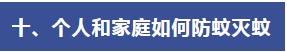 (四)室內(nèi)滅蚊。室內(nèi)可使用合格的殺蟲氣霧劑、蚊香液、盤香等減少蚊蟲叮咬。使用發(fā)煙滅蚊片或全屋用殺蟲氣霧劑施藥時(shí),應(yīng)先關(guān)閉門窗,施藥后人員離開,30分鐘后再開窗徹底通風(fēng)后方可進(jìn)入。室內(nèi)如發(fā)現(xiàn)有成蚊滋擾時(shí),應(yīng)及時(shí)開展室內(nèi)滅蚊。此外,蚊蟲較多區(qū)域,可配合使用電蚊拍、滅蚊燈等物理滅蚊工具。