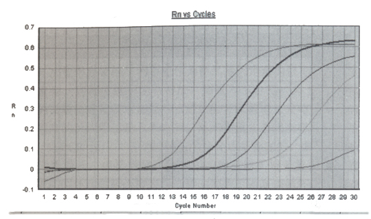 FQ-PCR的工作原理[1-3]是利用Taq酶的5’ → 3’外切酶活性,在PCR反應(yīng)系統(tǒng)中加入一個熒光標記的探針。該探針可與引物包含序列內(nèi)的DNA模板發(fā)生特異性雜交,探針的5’端標以熒光報告基團FAM(6-羧基熒光素,熒光發(fā)射峰值在518mm處),靠近3’端標以熒光淬滅基團TAMRA(6-羧基四甲基諾丹明,熒光發(fā)射峰值在582nm處),兩者之間構(gòu)成能量傳遞結(jié)構(gòu)。當探針保持完整時,5’端熒光報告基團所激發(fā)出的熒光信號被3’端淬滅基因吸收或抑制,不出現(xiàn)熒光信號變化。當PCR反應(yīng)體系中有目的基因存在,就會擴增出特異核酸片段,熒光探針即會根據(jù)堿基配對的原理與之雜交。當PCR進入延伸(復制)期,Tap酶從引物3’端開始,隨新鏈延伸沿DNA模板移動,當移動到探針結(jié)合的位置時,其5’→ 3’端外切酶活性作用,將探針切斷(切口平移效應(yīng))。熒光報告基團和淬滅基團間的能量傳遞結(jié)構(gòu)被破壞,淬滅基團的淬滅作用被解除,熒光報告基團的熒光信號釋放出來(圖1)。PCR反應(yīng)每復制一個特異核酸片段,就有一個探針被切斷,伴隨一個熒光信號的釋放。由于被釋放的熒光基團數(shù)目和PRC產(chǎn)物是一對一的關(guān)系,因此用熒光檢測技術(shù)檢測出的熒光信號有無或強弱,即代表擴增產(chǎn)物有無或多少。由于熒光信號是代表擴增產(chǎn)物的有效特異信號,無需進行有效和無效信號分離,實現(xiàn)了儀器實時檢測(圖2),為新的PCR定量原理創(chuàng)造了條件。