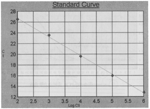 ABI公司首先根據(jù)上述原理研制了ABI 7700 等系列定量PCR儀,在PCR反應(yīng)中設(shè)置標準模板系列(一般5~7個標準濃度)反應(yīng)管和空白對照管。通過實時檢測反應(yīng)管中的熒光信號,計算出RQ+、RQ-、△RQ。RQ+代表樣品管熒光報告基團發(fā)光強度與淬滅基團發(fā)光強度的比率,RQ-代表空白管中二者的比率,△RQ(△RQ = RQ+-RQ-)代表PCR過程中熒光信號變化量。當熒光信號增強到某一閾值(根據(jù)熒光信號基線的平均值和標準差,計算出以99.7%的置信度大于平均值作為閾值)時,標準模板反應(yīng)管所用的循環(huán)次數(shù)(Ct值)就被記錄下來。Ct值與標準模板數(shù)量的對數(shù)值之間有嚴格的線性關(guān)系[3],利用系列標準模板的Ct值,制成標準曲線(圖3),根據(jù)待測樣品的Ct值,就可在標準曲線中確定待測樣品起始的DNA數(shù)量。根據(jù)數(shù)據(jù)處理,即可得出定量結(jié)果。探針設(shè)計一般應(yīng)符合以下條件[2]:①探針長度應(yīng)在20~40個堿基左右,以保證結(jié)合的特異性。②GC堿基含量在40%~60%,避免單核苷酸序列的重復。③避免與引物發(fā)生雜交或重疊。④探針與模板結(jié)合的穩(wěn)定程度要大于引物與模板結(jié)合的穩(wěn)定程度,因此探針的Tm值要比引物的Tm值至少高出5℃。另外,探針的濃度,探針與模板序列的同源性,探針與引物的距離都對實驗結(jié)果有影響。