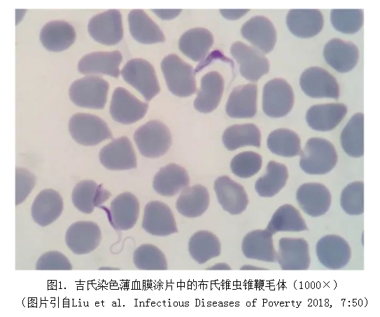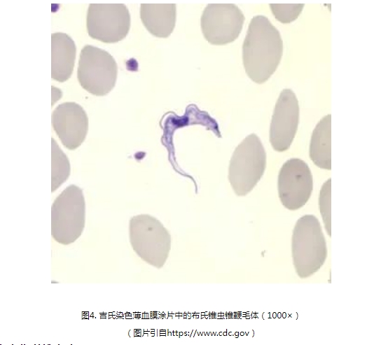 三是實(shí)驗(yàn)室檢查病人血清中布氏錐蟲抗體是否陽(yáng)性,病人血液、淋巴液、下疳抽吸液、骨髓穿刺液或腦脊液鏡檢中是否查見布氏錐蟲錐鞭毛體(如圖4),或布氏錐蟲核酸檢測(cè)陽(yáng)性。